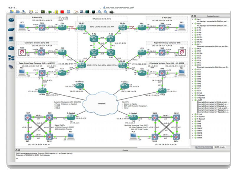 Emuluje správanie sieťových zariadení od viac ako 20 rôznych svetových výrobcov . GNS3 je najlepší študijný nástroj pre začínajúcich sieťových profesionálov, ktorí pracujú na svojich certifikáciách, bez potreby domáceho laboratória a teda drahého HW.